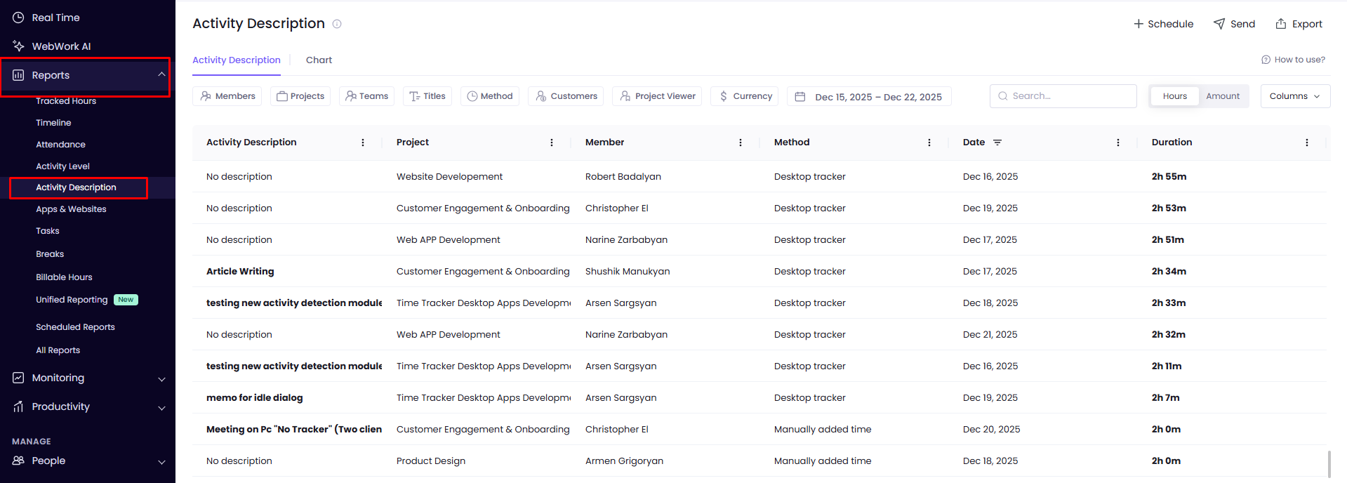 On this page, you can see the activity descriptions your workspace members have entered while tracking time in a specific period. You can also view the type of tracking in the Methods column.
