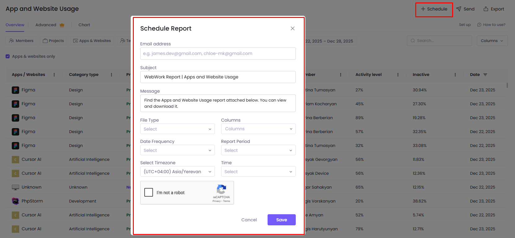 On App and Website Reports, you can see the apps and websites (including URLs) used by your workspace members, their tracked time on them, member activity levels, and more.