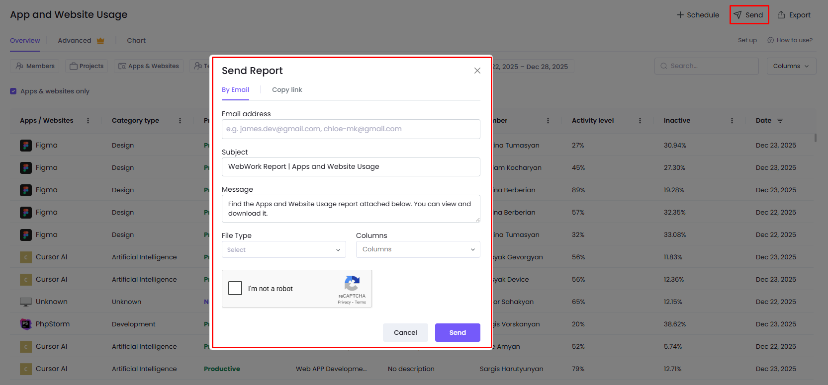 - By clicking on the button Send, a pop-up will appear on your page with two windows. On the first one you will see written By email. By filling in the necessary information, such as the email address, the subject of the email and message text, as well as selecting the convenient file type for export (CSV or XLSX), you will be able to send the report immediately to the person’s email. In the next section you will see the Copy Link text. In this case you can simply share the link which will available even for people who do not have a WebWork account.