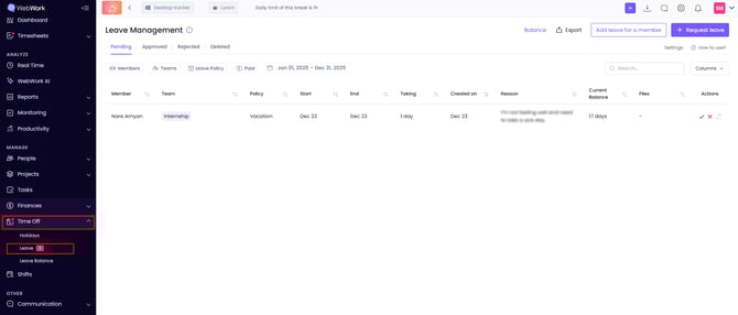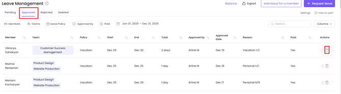 By default, this page will show you the Pending tab. These requests haven’t yet been approved or rejected. The Approved and Rejected tabs will show you approved and rejected leave requests respectively.