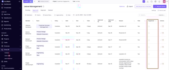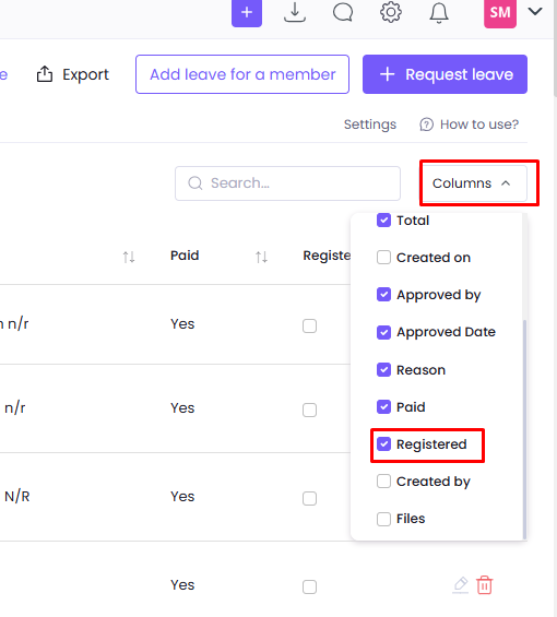 Note, that there is a Registered column in the Columns section. You can enable it in order to mark the registered leaves. This does not affect any detail or calculation, it is just an addition information for you own use.