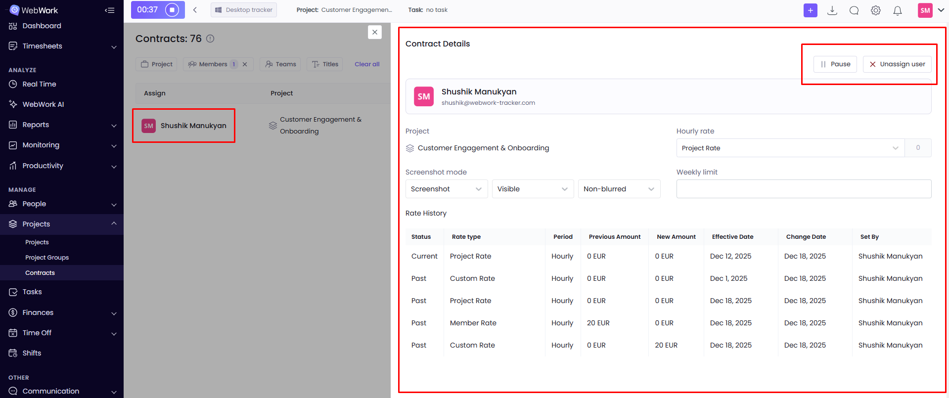 - To be able to view the contract’s details or rate history you can click on the contract and a side panel will appear will all the information about it. Here you can also pause or unassign a user from a contract.