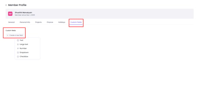 After clicking on it you can decide whether you want the field to be a text field, number, dropdown, or a checkbox. By creating the field it will appear in all the members info panel that exist in your workspace, not just this one specific member.