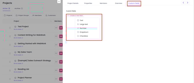 After clicking on it you can decide whether you want the field to be a text field, number, dropdown, or a checkbox. By creating the field it will appear in all the projects that exist in your workspace, not just this one specific project.