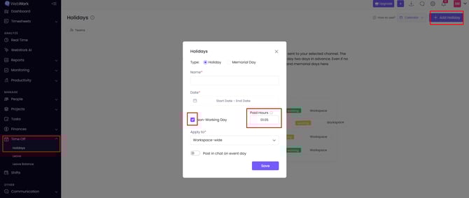 The Holiday feature allows you to set working and non-working days for your workspace.