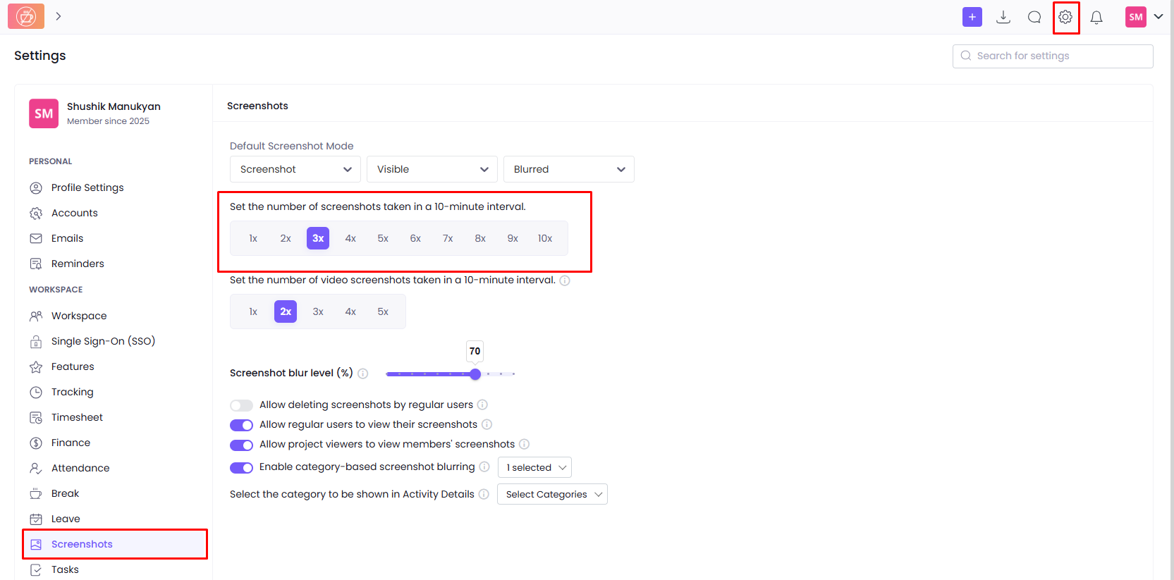 To change the frequency of screenshots, go to Settings>Screenshots. Under Set the number of screenshots taken in a 10-minute interval, you can select the frequency from 1-10 in a 10-minute interval.