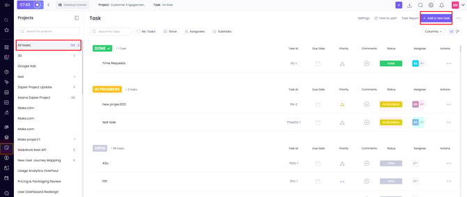 - Select the project you want to add a task to and click Add a new task in the top-right corner.