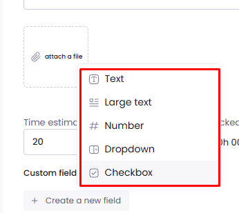 You can also add custom fields to your tasks, if you feel like it will be necessary to include all the information about the task description in that way. To do that click on the Create a new field button while creating the task. To do that click on the Create a new field button while creating the task.