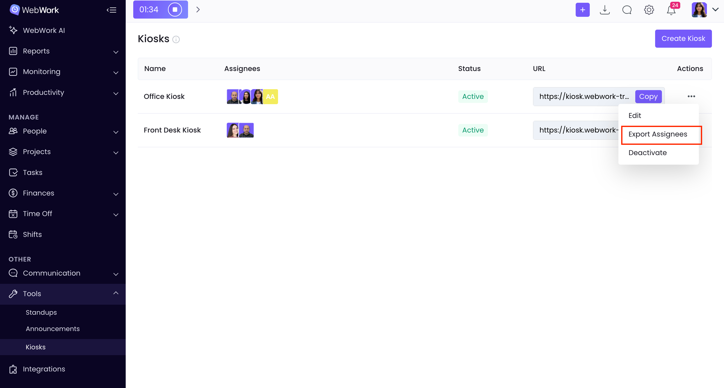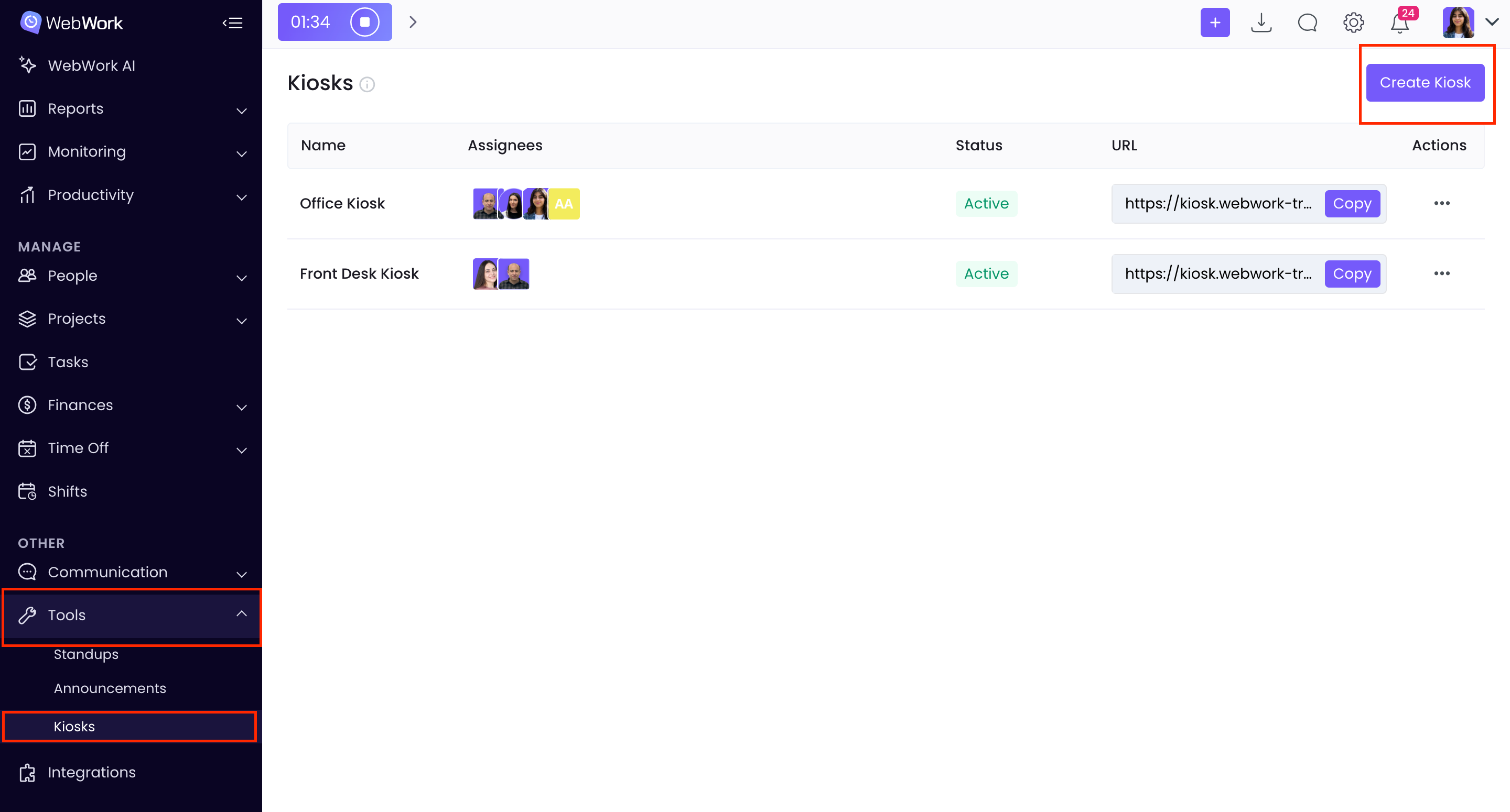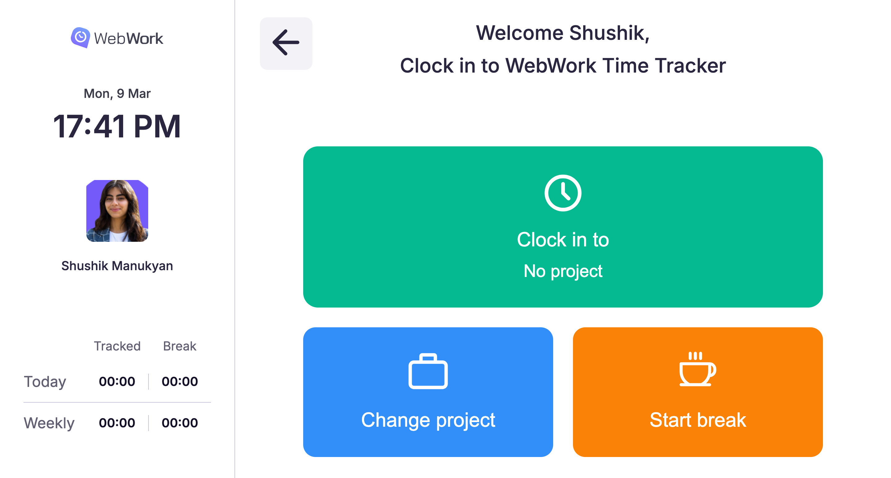 Kiosk in WebWork allows multiple employees to clock in/out, start or stop breaks and track on specific projects and tasks. It works from any internet connected device and mostly is used in such cases when multiple employees are working from the same device.