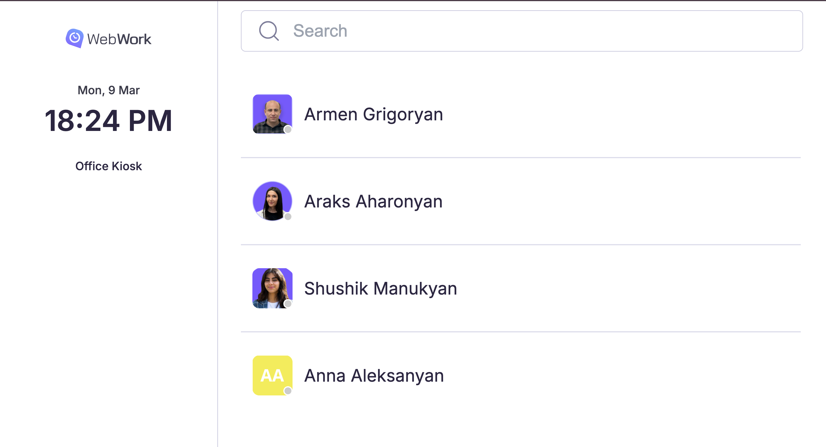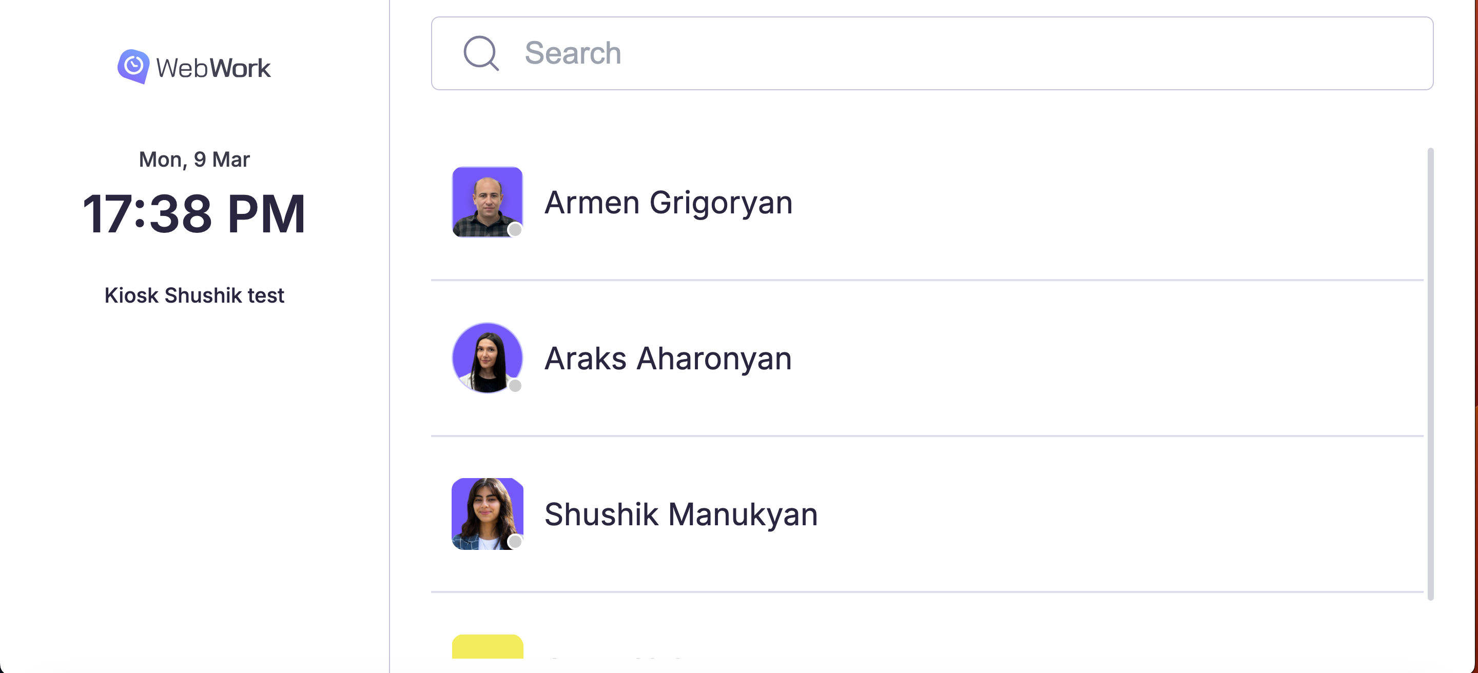 Kiosk Mode is a shared time-tracking interface designed for workplaces where multiple employees record their attendance and work activity from a single device. Instead of each employee logging into their personal account on separate devices, a central device (such as a computer, tablet, or terminal) is set up as a kiosk station where employees can quickly identify themselves and track their working time.