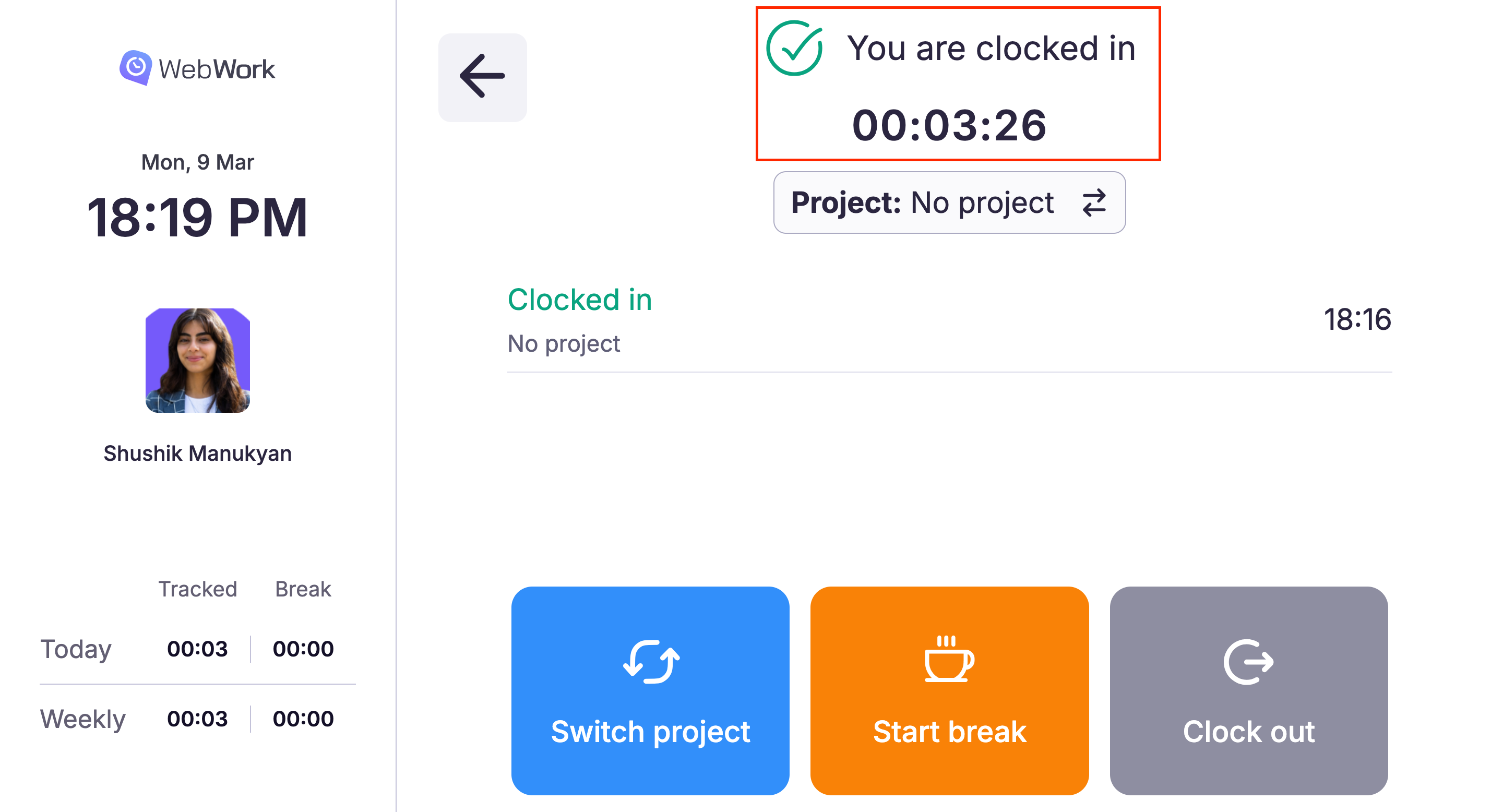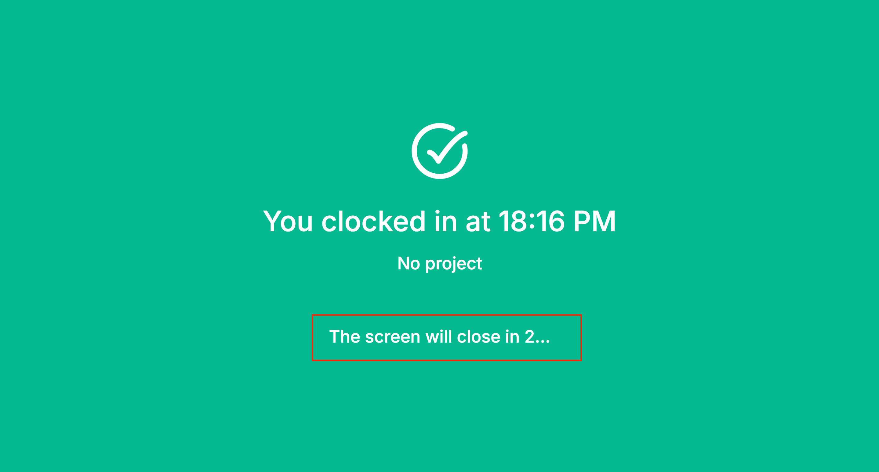 Hence, if you are clocked in, you will see the status on your screen, under which you can also see the time you have tracked so far.