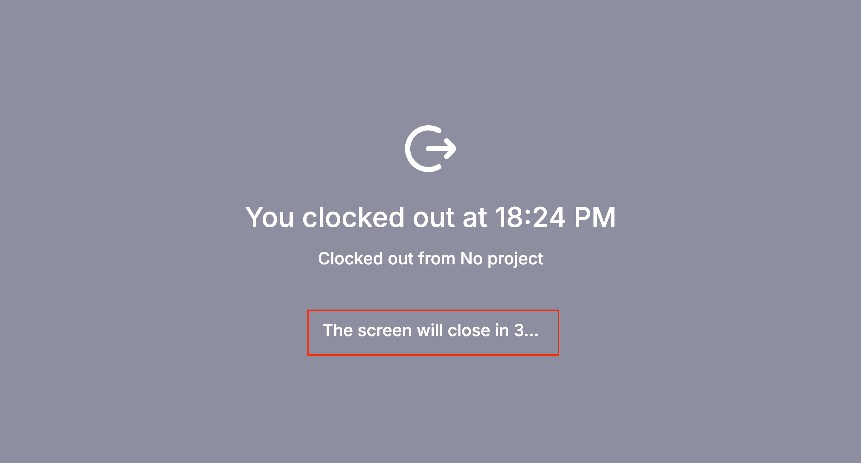- Clock out - this button will be available only if you are clocked in. A very similar process occurs to clocking in, when you want to clock out. As soon as you click on the Clock out button, a grey screen appears with the countdown again, warning you that in three seconds you will be clocked out. After the three seconds, you can see yourself clocked out. The screen with the assigned users appears on your device and in order to clock in again, you should select your name, write the PIN (if it is required) and clock in once again.