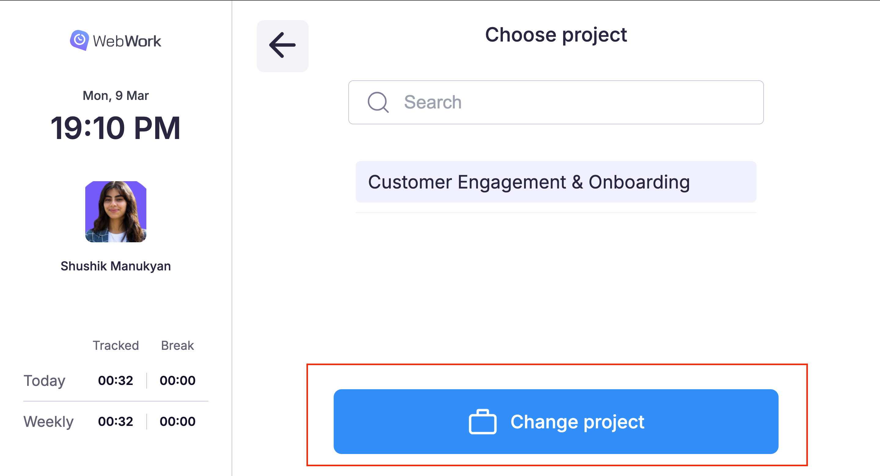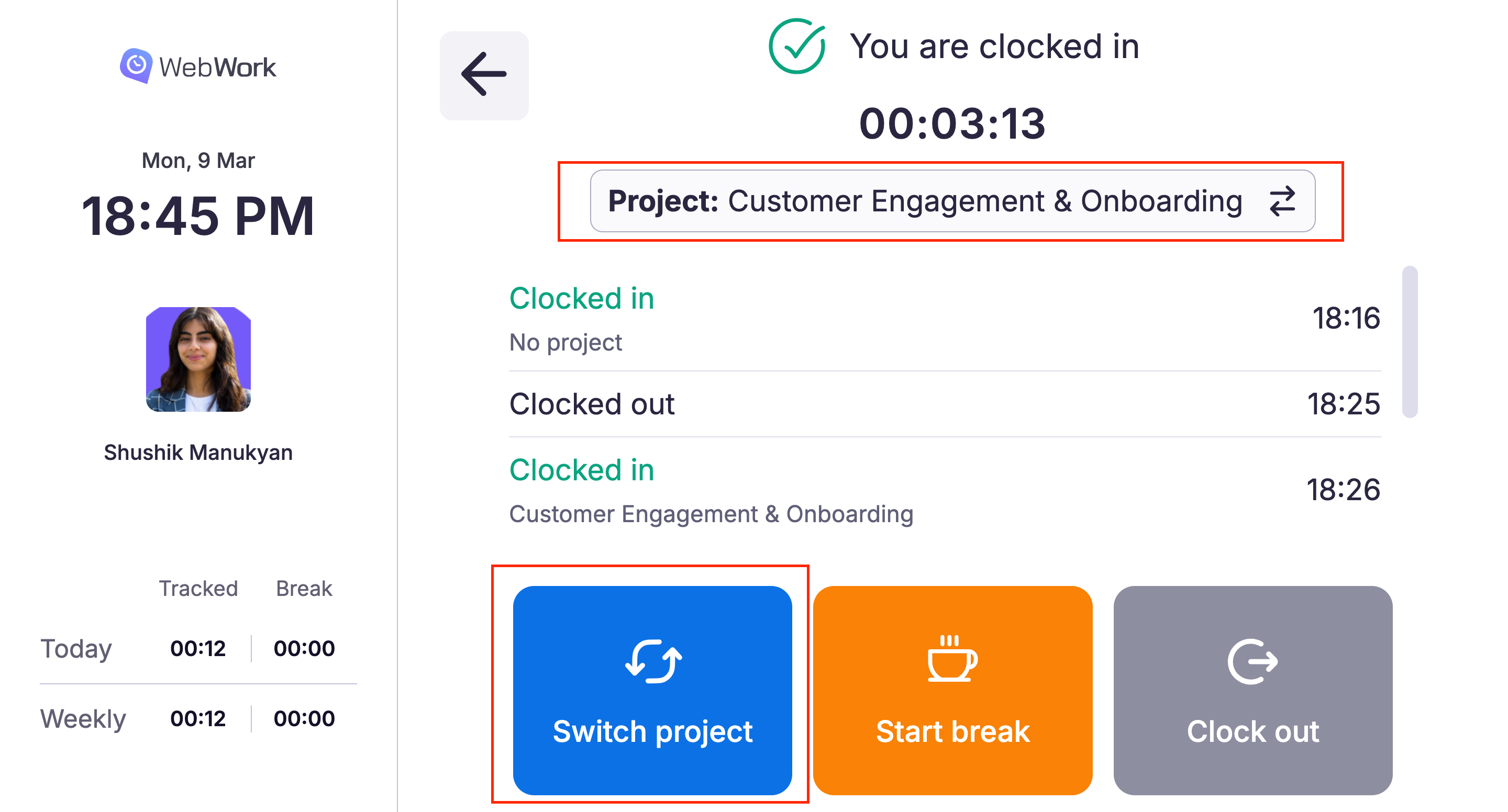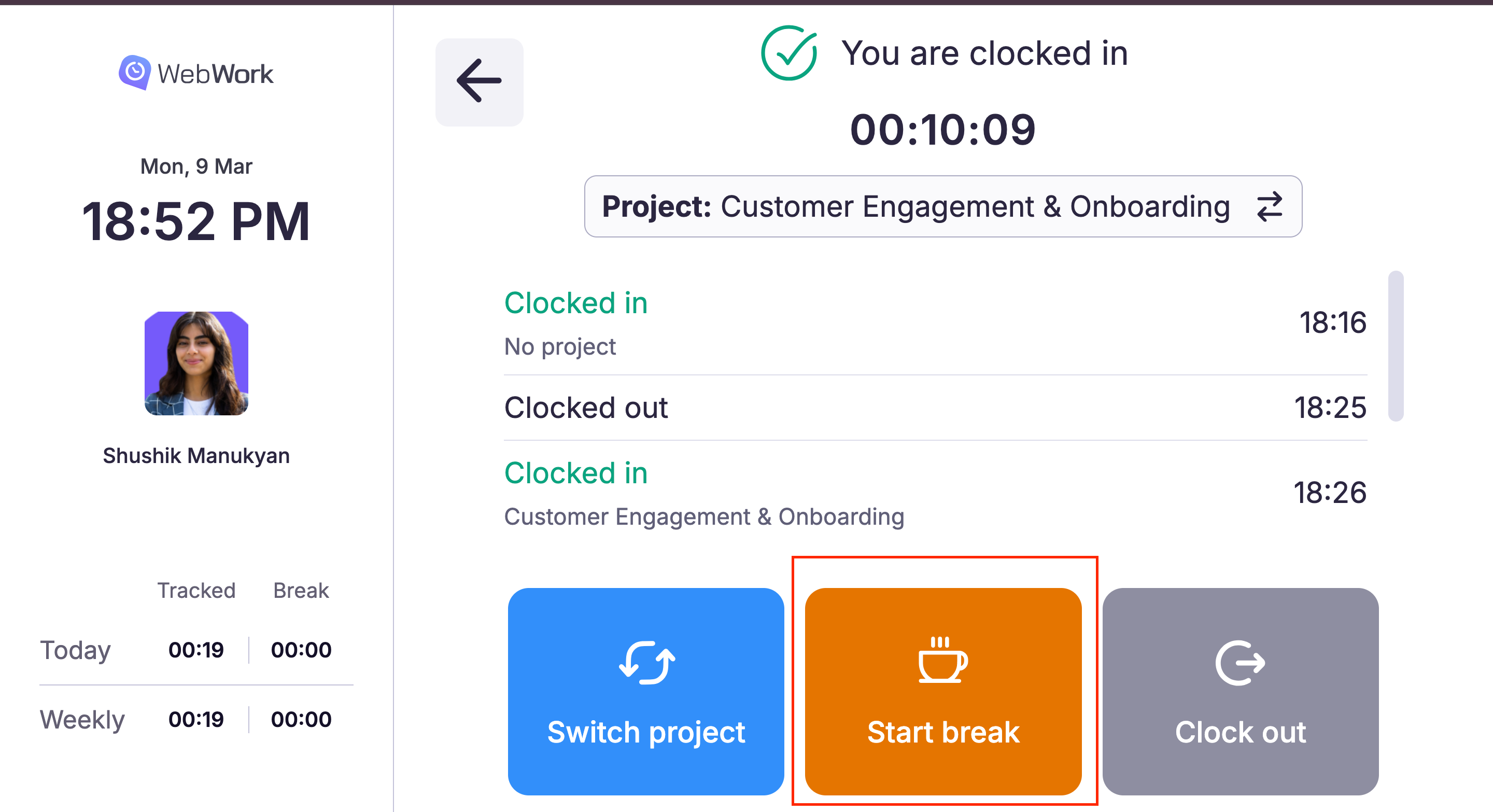 You can see the assignees in the right part of the screen. The member who is tracking should click on their name, write their PIN after which will see the options to start the tracker, take a break or, if the permission is enabled, also track on specific projects and tasks: