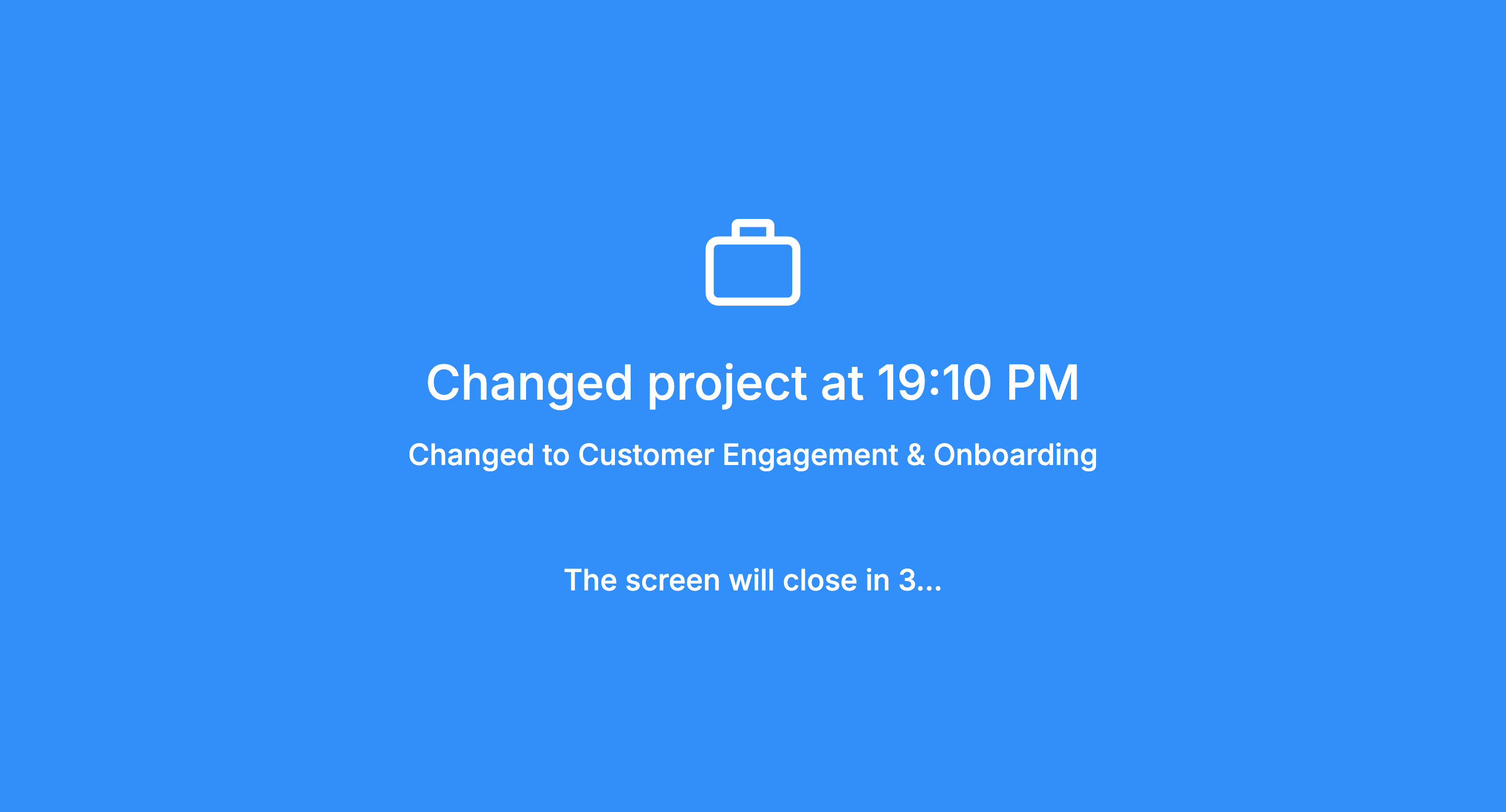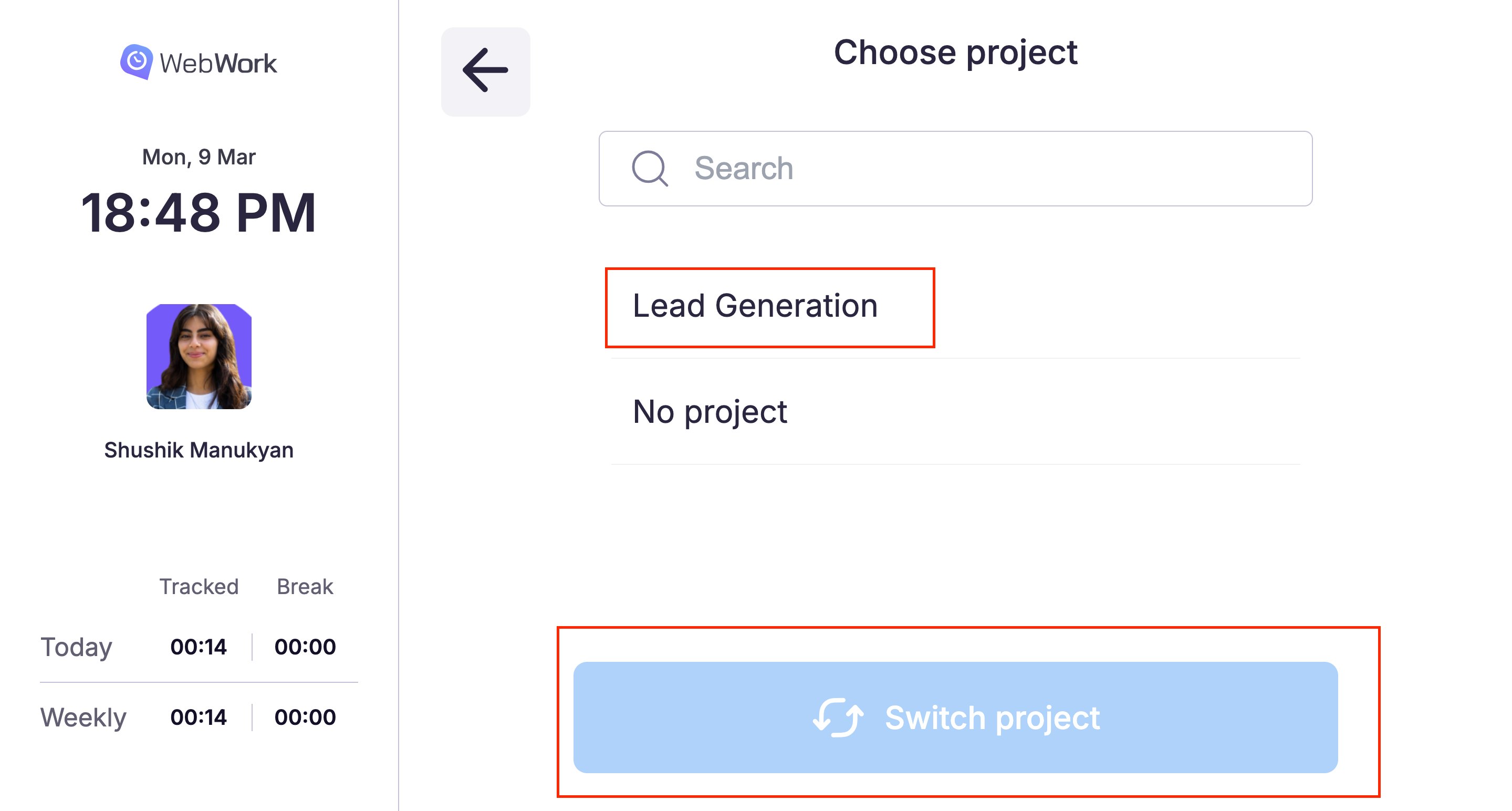 - If you want to keep the tracked time on the current project but start tracking on another one, click the Switch Project button. Your previous tracked time will remain on the original project, and tracking will continue on the newly selected project.