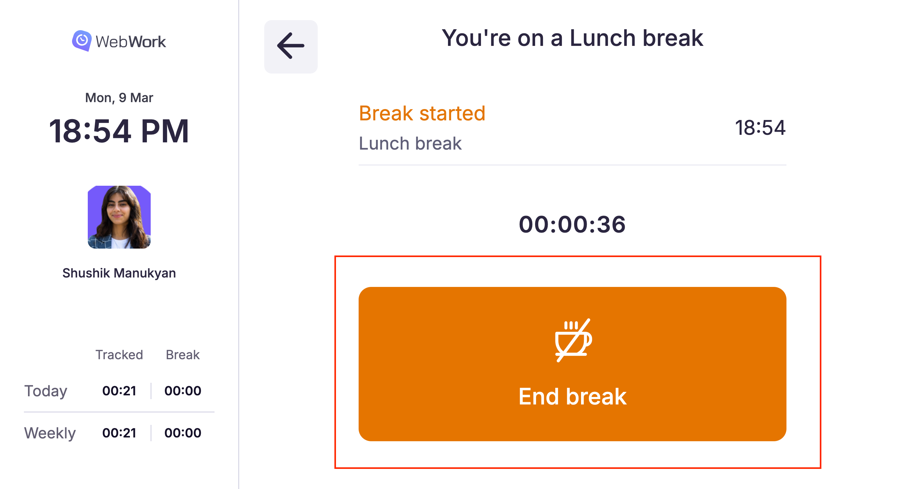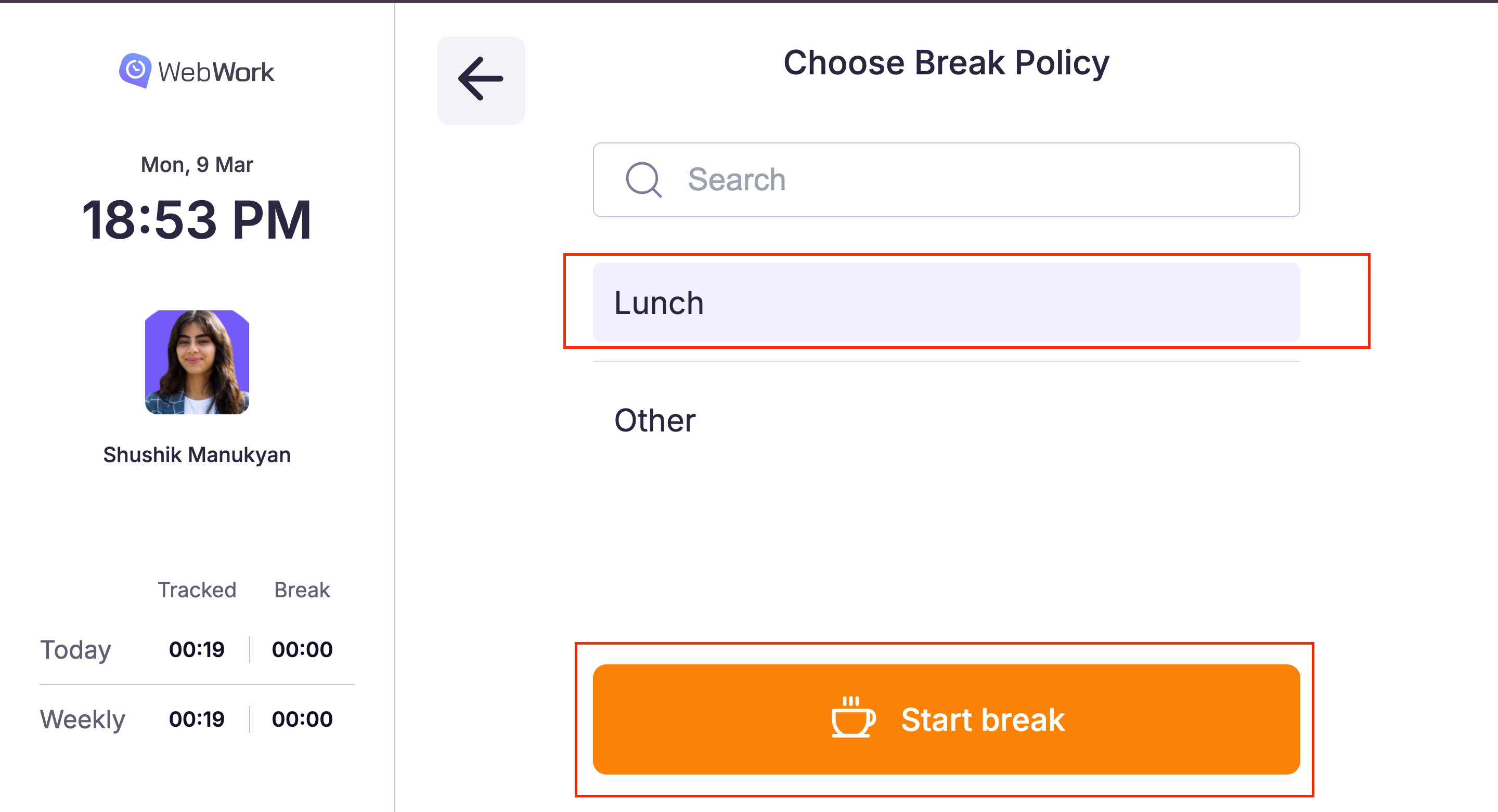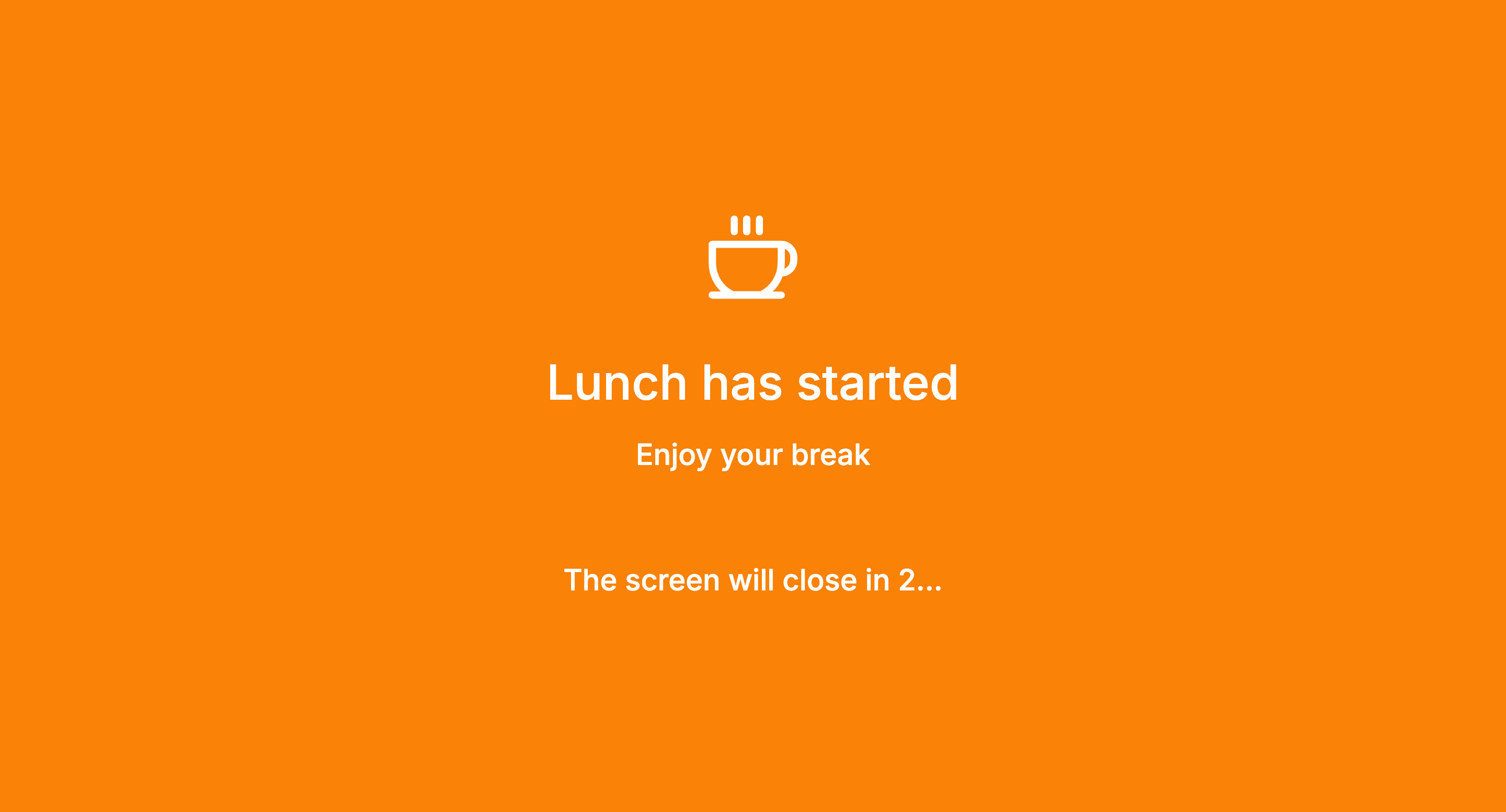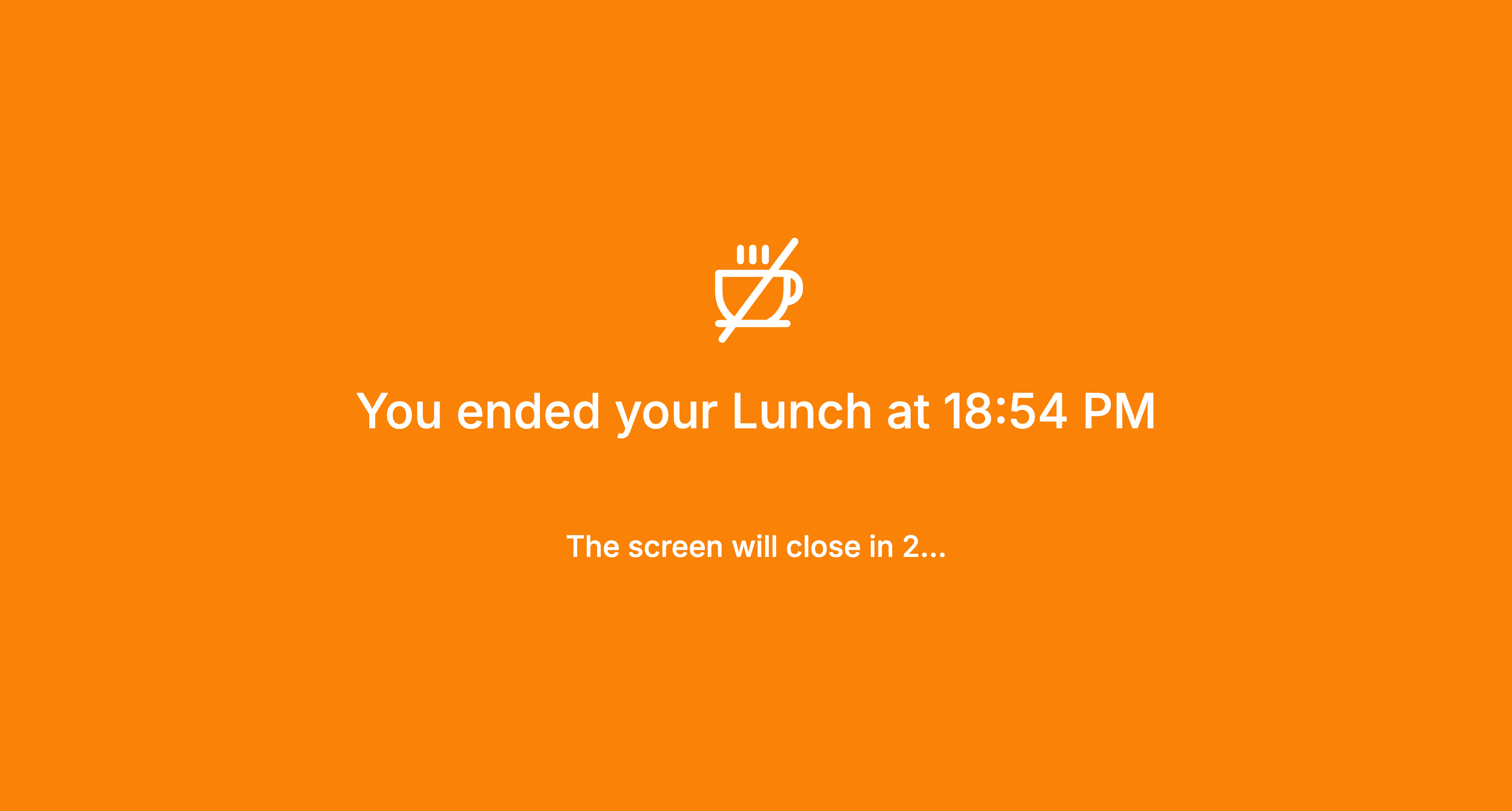- Start break - This button will be available only if a break is assigned to you. If you want to take a break, you can click on the Start break button, after which you should choose the break policy and start the break. An orange full screen appears with a three-seconds countdown in the bottom of the screen. After the three seconds your break starts. If you are done with the break, click End break, and you will see the regular kiosk screen again. You should manually clock in again in order to start tracking.