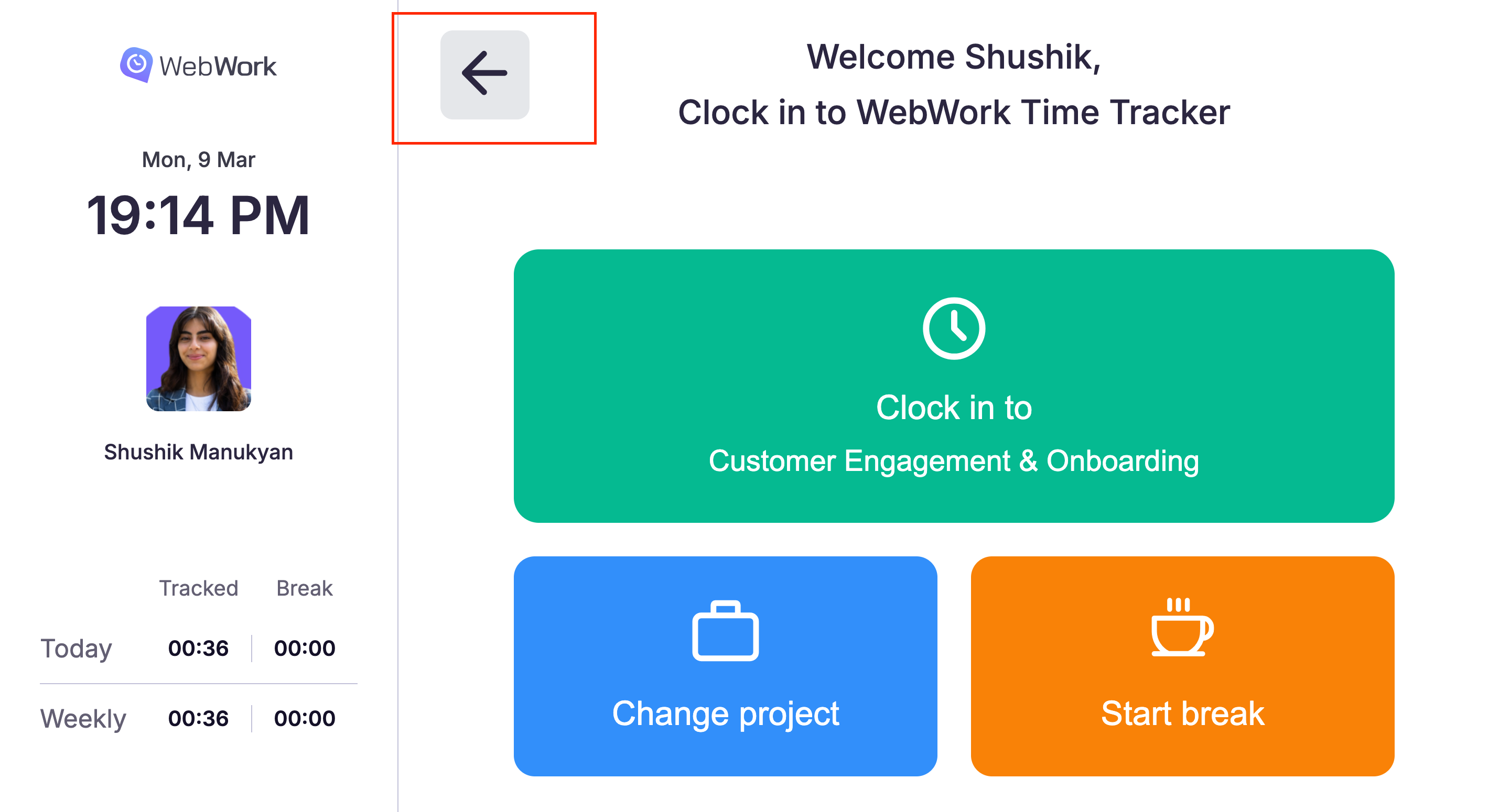 - Back button - You can click on the Back icon at the top of the screen and see the names of the assignees. Thus other people can clock in as well: