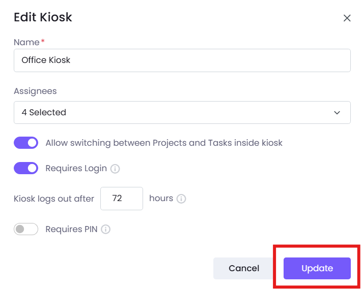 - By enabling the toggle Switch between Projects and Tasks inside kiosk you will give the employees the opportunity to track on specific projects and tasks.