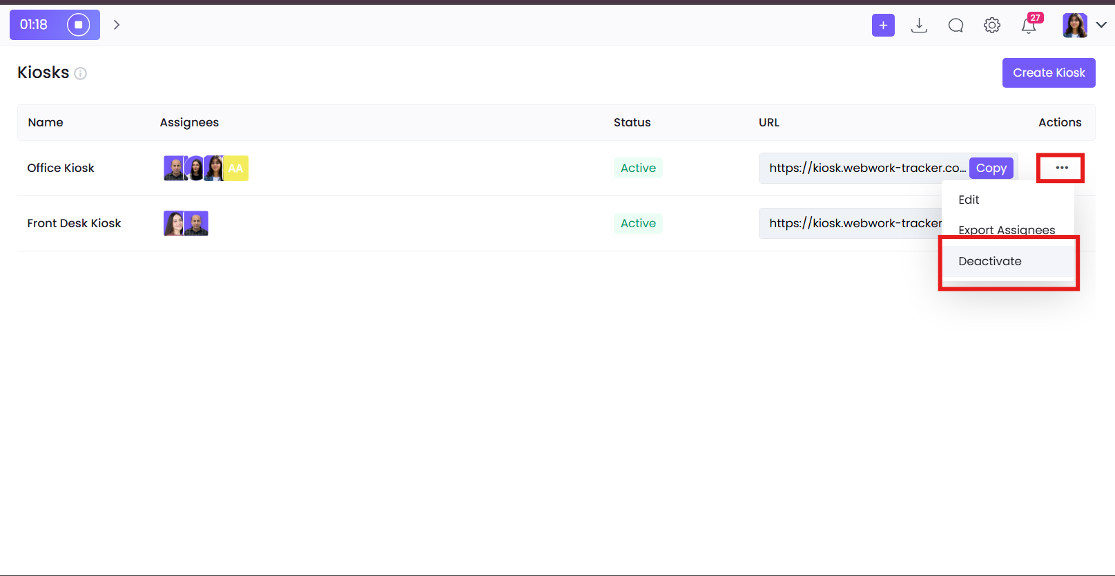 You can also deactivate a kiosk temporarily, if you think it will not be needed for some time. To deactivate the kiosk, click on the three dots next to it: