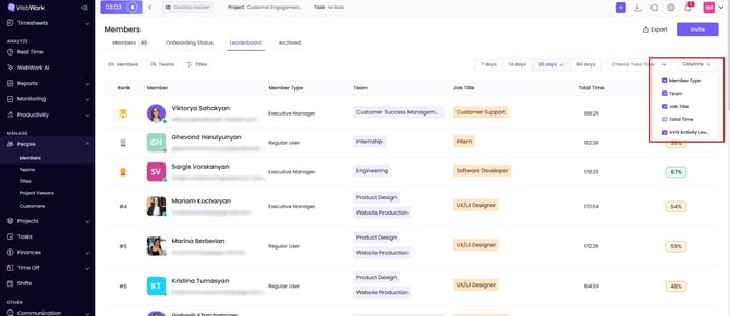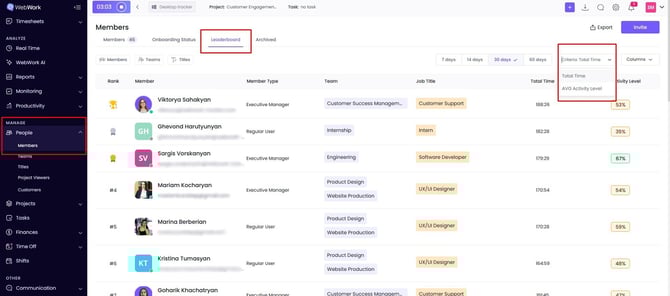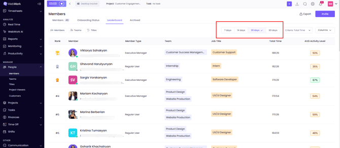 Leaderboard allows you to see and compare the activity or the tracked hours of your employees in WebWork. To access this feature: