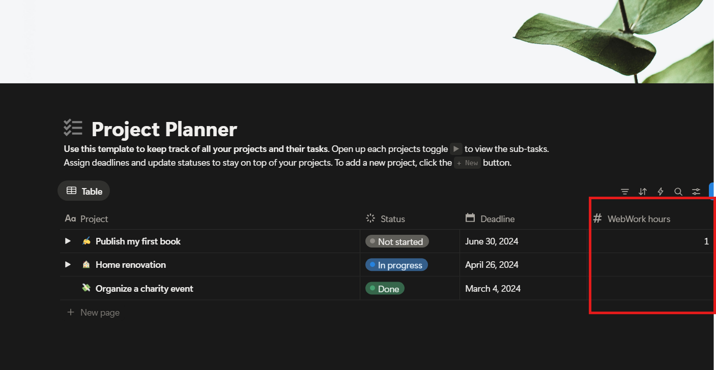 Particularly, you can sent the tracked time in WebWork to your Notion’s projects or tasks, however it is important to have a property type Number in Notion named “WebWork hours” for that: