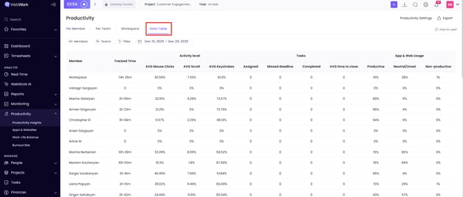 You can also view the information about your team’s or workspace’s productivity using Data Table view.