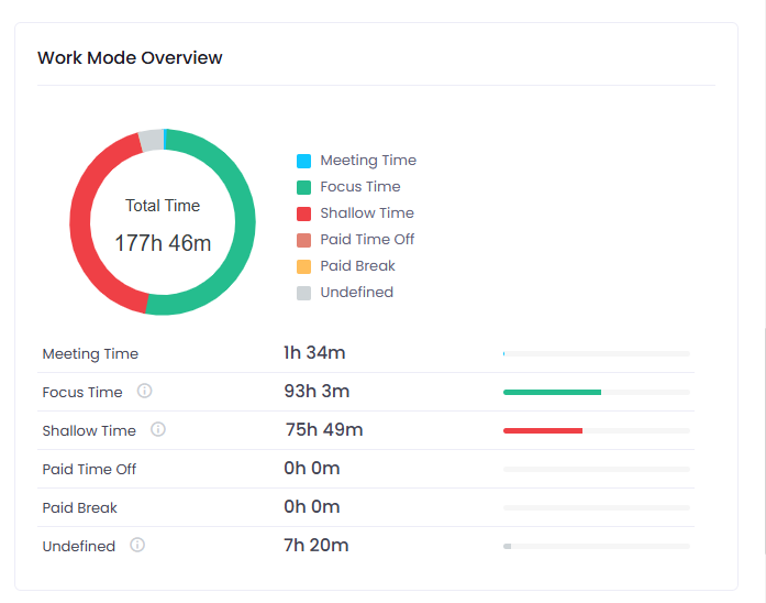 In Productive Insights you will also be able to see a section named Work Mode Overview if you are a Plus or a Premium user. Here you can see the focus time, shallow time, meeting time, paid time offs and breaks as well as undefined times, which do not fit into any of these time categories, mostly manually added time. Focus time indicates the time with high activity, this is the time spent actively working without distractions. Shallow time, in contrast, combines the time spent working at a lower activity level.