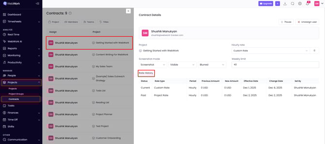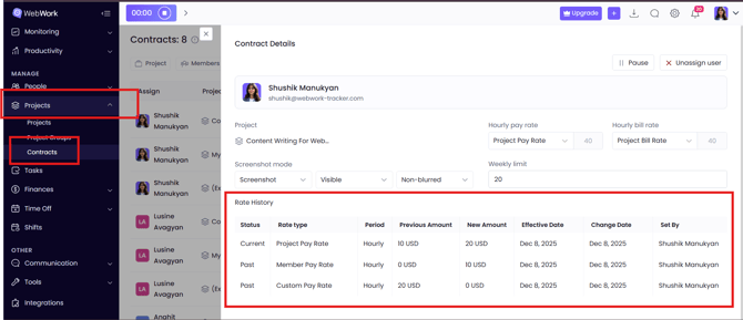 If you want to view the Contracts rate history you can go to Projects and this time click on Contracts. Remember, Contracts equal assigning projects to members, setting their hourly rate, weekly hour limit, and screenshot mode.