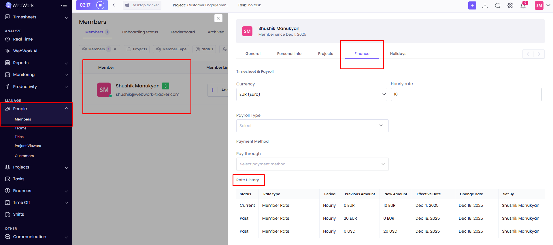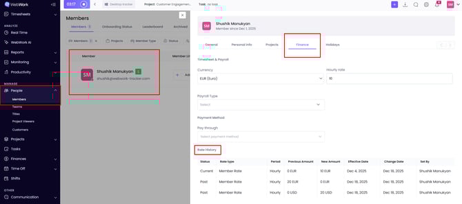 Here you will be able to see all the members added, synced or imported to your workspace. When you click on the specific member, you will have the opportunity to view their detailed information. Under the Finance section, in the bottom, the Rate History feature is available.