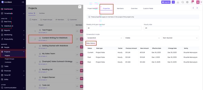 If you want to view when, how and who made changes to members’ or projects’ rates, WebWork has a feature called Rate History which is available in the side panel for a separate Member, Contract or Project. Depending on which rate changes you want to view, you can navigate to the Member, Project, or Contracts page.