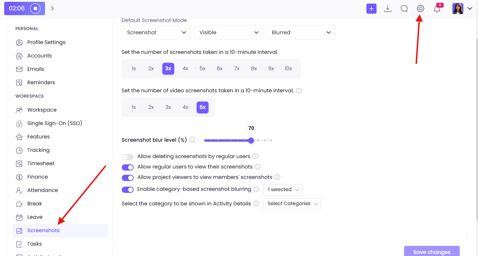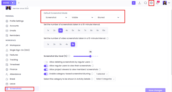 There are several settings available to customize screenshots. You can adjust the frequency, choose the screenshot mode, and set other preferences depending on your workspace’s needs by going to Settings, then Screenshots.
