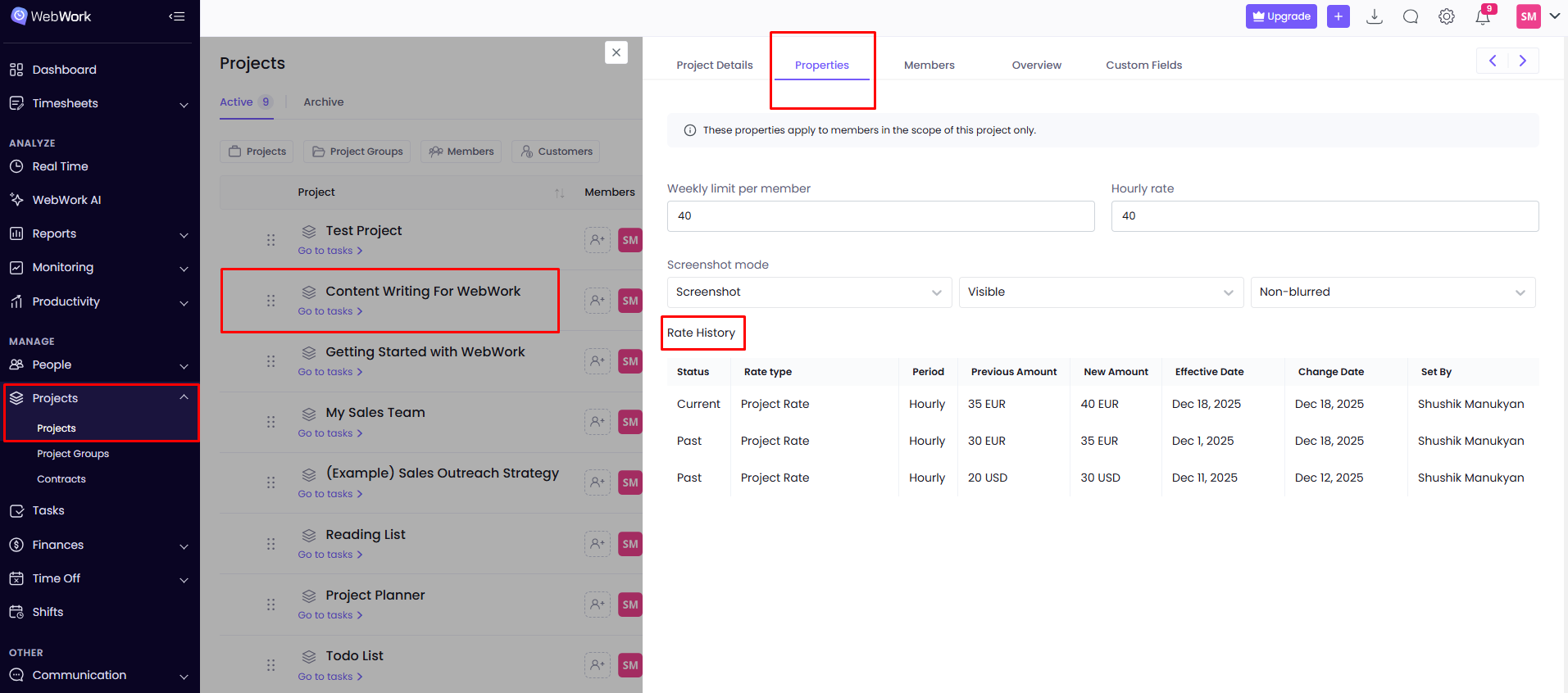 The Workspace Owner and Executive Managers can enable the Billable toggle and set hourly rates for all projects. Team Managers can set hourly rates only for the projects of members they manage, though they cannot change the Billable option of any project.