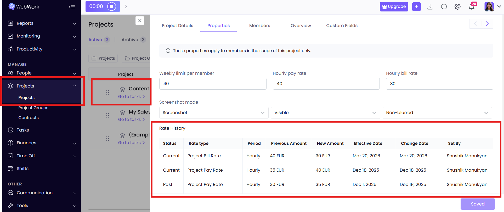 After setting all the necessary parameters about the project’s rate, you can view their rate change history later, if you are a Plus or a Premium user. To view the rate history you should select the project you want to review the rate for and go to Properties. You will see a table at the bottom.