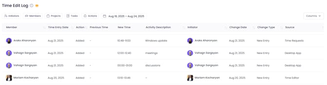 In the report, you can see time edit logs such as time entries added, edited, or deleted by members, both for themselves and for others.
