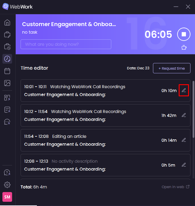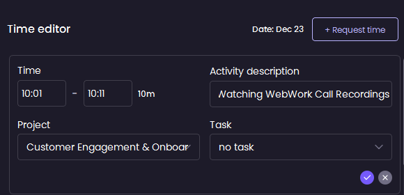 Another way of requesting time is right from the desktop app. In order to request time without entering your dashboard click on the Add and edit time section on your desktop app (the section with the time icon). Then click on Request time. Note, that if you are under one of the selected roles that can add time without requesting (such as Executive Manager), then this button will be Add time instead of Request time. Hence, you can add/request your time directly from the desktop app.