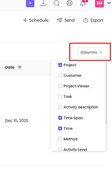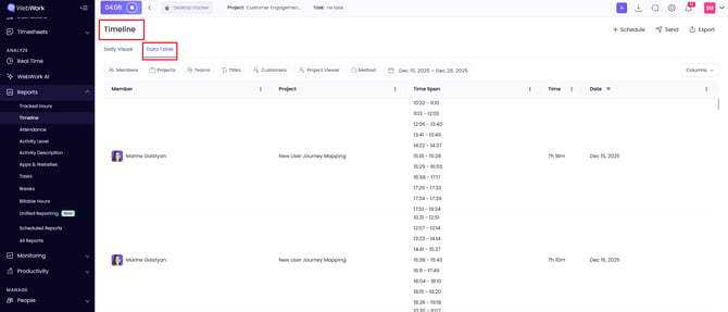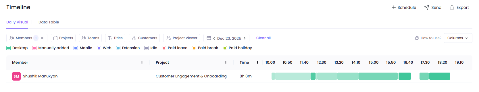 Here you can see the time span the member was working on a specific project or tasks, as well as the short pauses and inactive times that were taken during the working period. You can apply filters or customize the columns depending on which columns you would like to see.