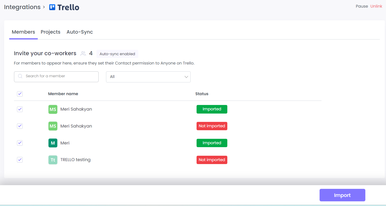 - Members: Your Trello members will be reflected here. You can import them all or some by selecting with checkbox. Not imported members are marked with red, after importing they are marked with green. Members already registered in WebWork with the same email as in Trello, will be synced. Otherwise, members will be imported to WebWork, and an invitation will be sent to their email. After accepting the invitation, they will become active members of WebWork as well.