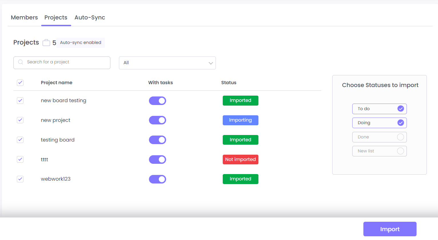 All task statuses are selected by default, but you can choose specific ones by checking the boxes, and only the selected items will be imported. It might take a while to import projects so after toggling import please wait for a minute and refresh the page to check the current status.