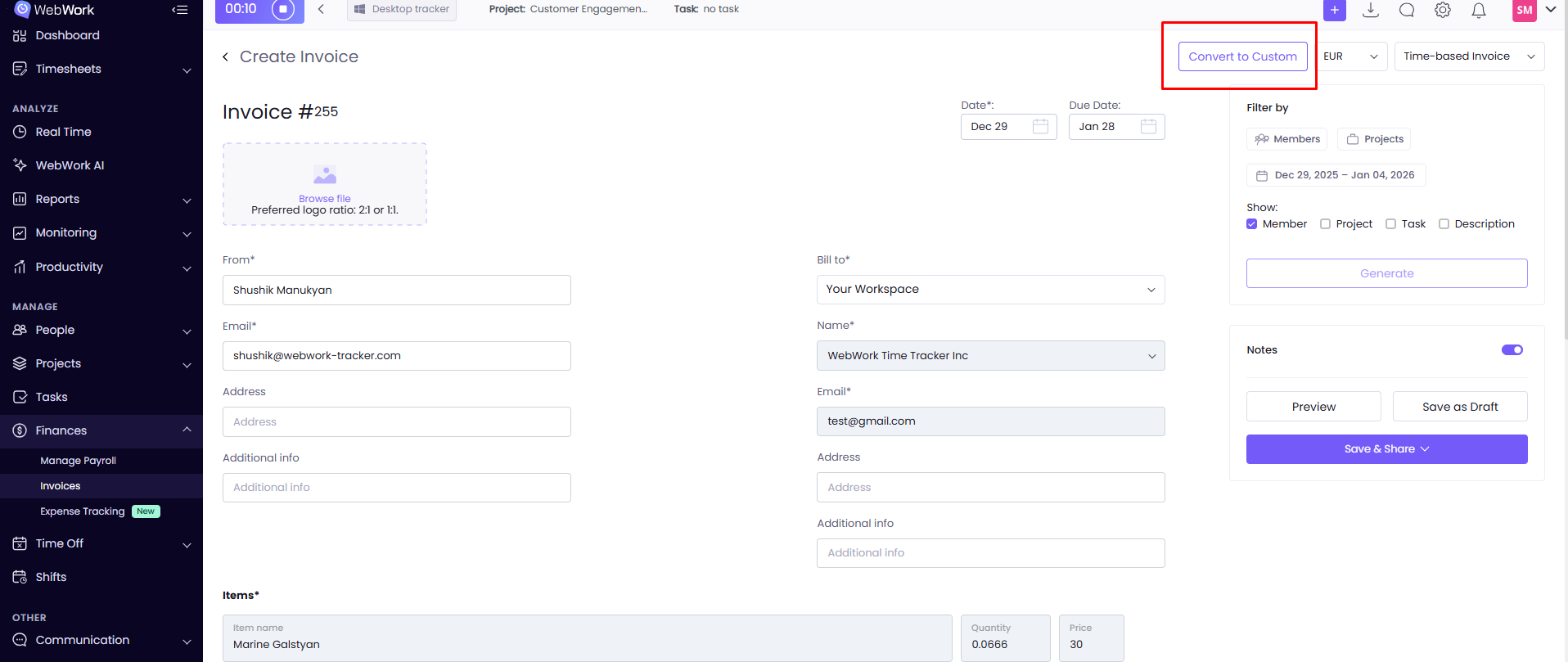 Additionally, there is an option to convert an hour-based invoice to a custom invoice, allowing you to make changes to it. Since item names, quantities, and other details cannot be edited in hour-based invoices, converting it enables you to modify these fields. To access this feature, click the Convert to Custom button: