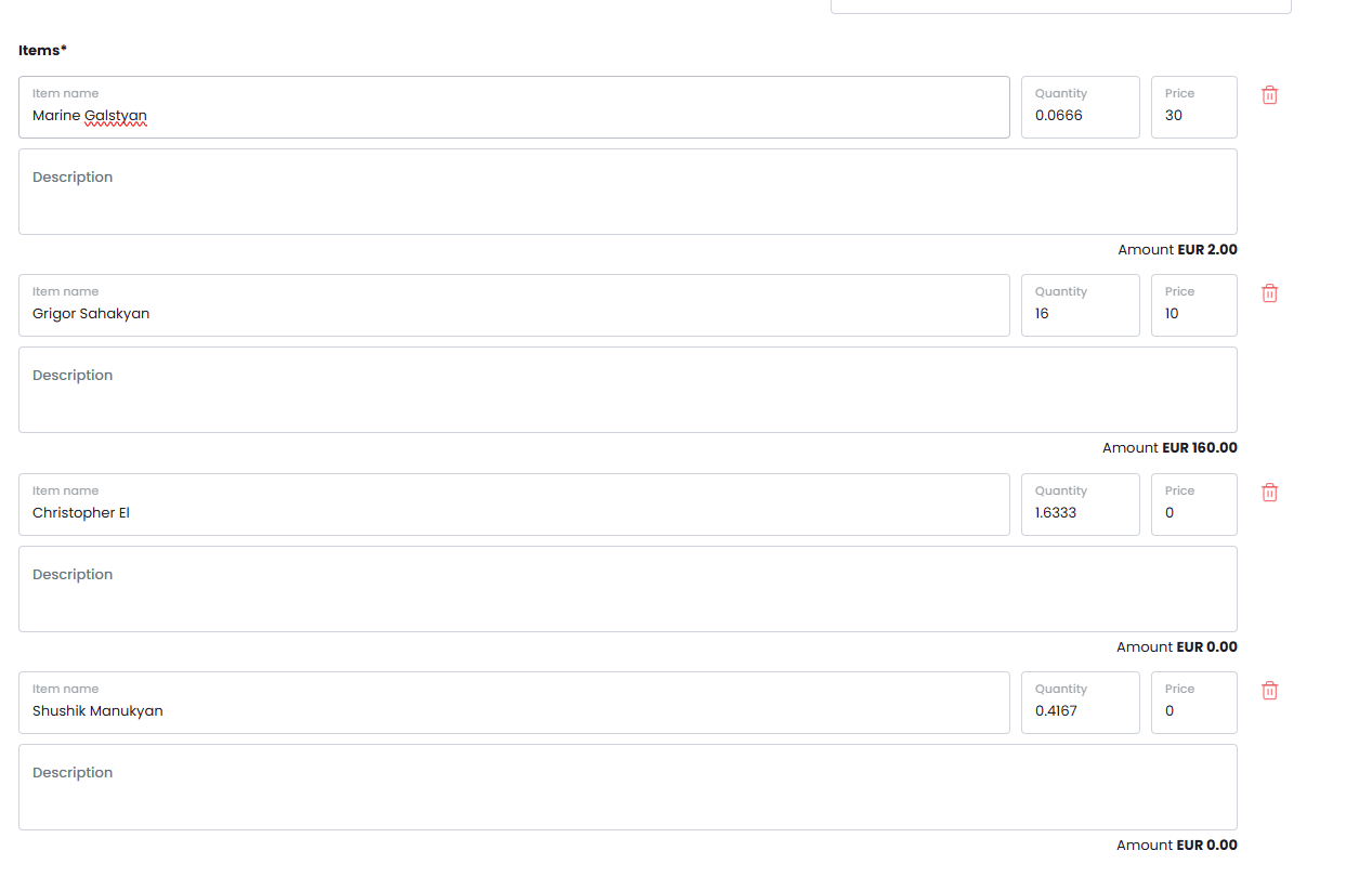 - Items: the details of the invoice’s payable items, including description, quantity, and price