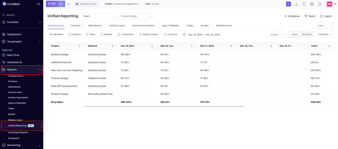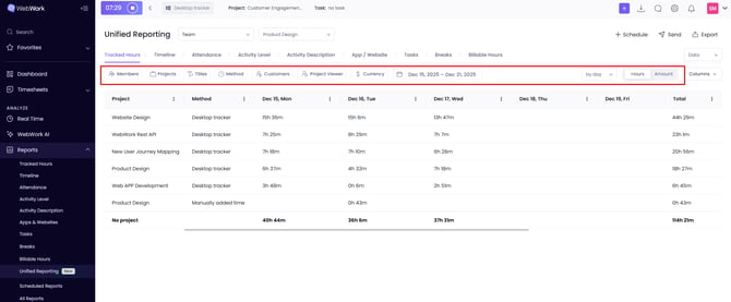 Depending on which team’s, project’s, member’s or title’s reports you want to view, you can filter by Member/Team/Title/Project. This filter is situated next to Unified Reporting. This way you will have access to all the reports about finance, time-tracking, attendance, activity level and more in one centralized location for that specific category. You should click on the relevant section under Unified Reporting to be able to see the particular reports.
