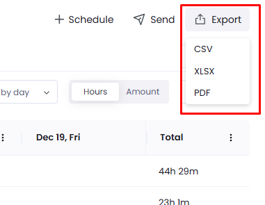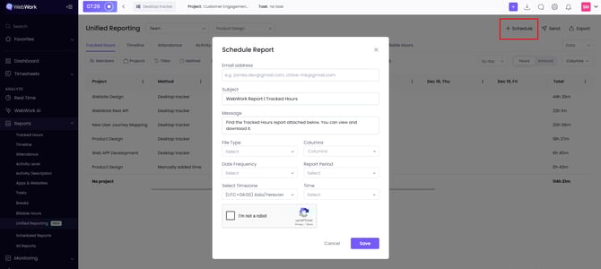 1. Share these reports with the WebWork link, even for people who do not have a WebWork account, by clicking Send and copying the given link or by entering the recipient’s email address and selecting the preferred file format.
