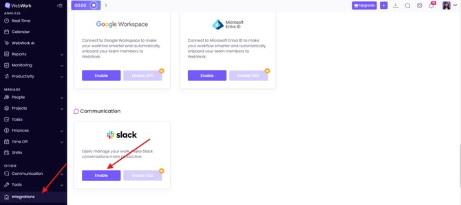 - The Owner/Executive Manager/Team Manager goes to the Integration section and sees the “Slack” in the “Communication” subsection