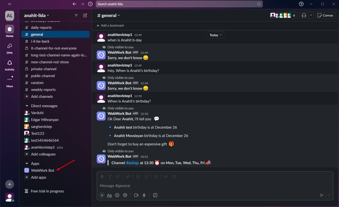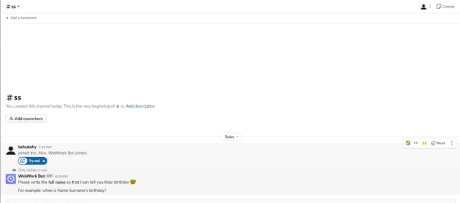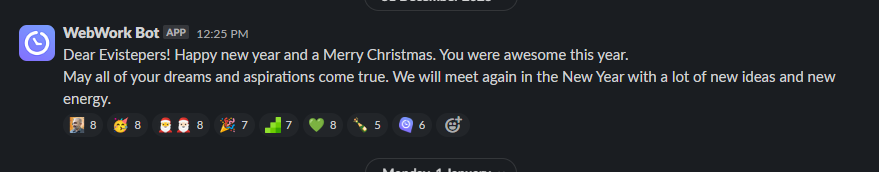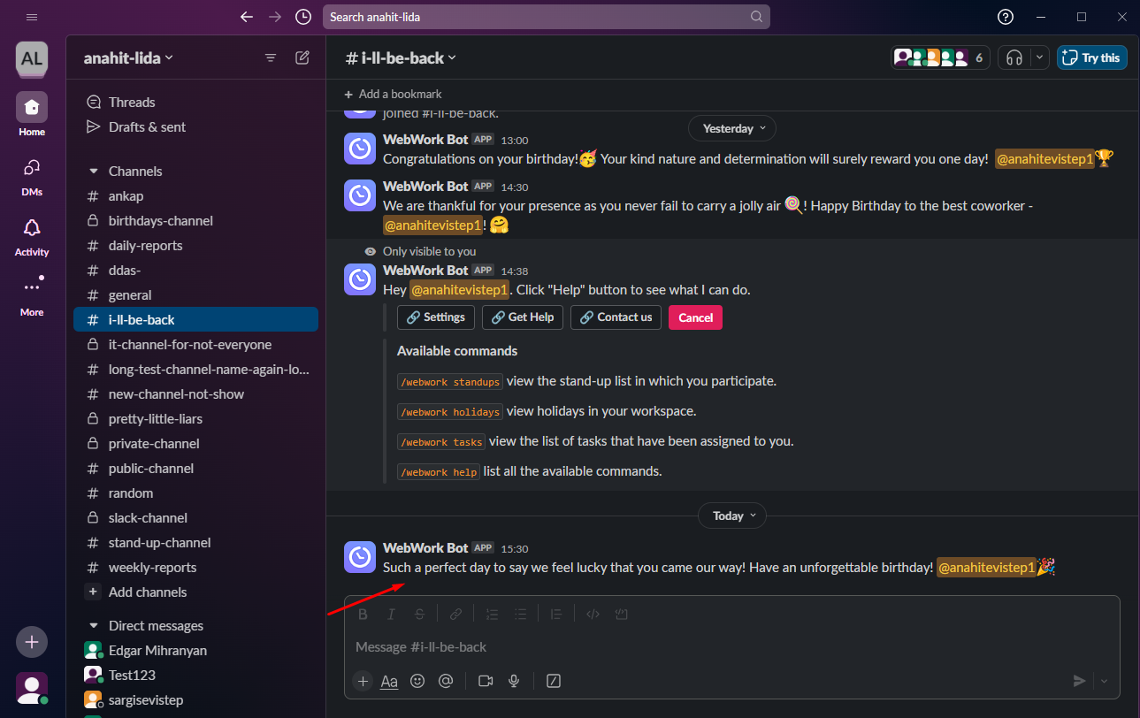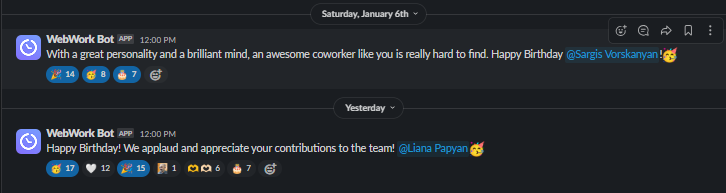 - If the user’s information about the birth is filled out on the user's WebWork account, a congratulatory message is displayed on the selected channel on the selected day and time (from the settings which can select Owner/Executive Manager)