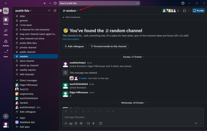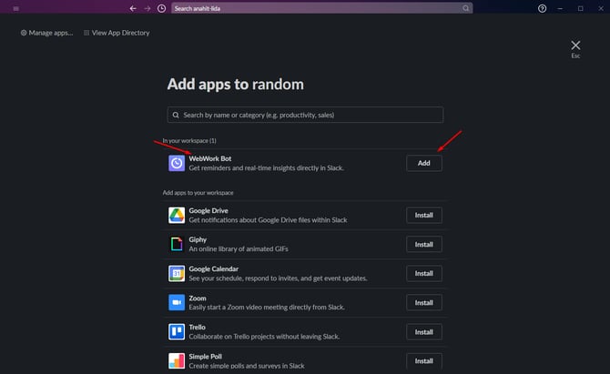 The member of the channel clicks on the channel's title and navigates to the “Integrations” section → can “Add WebWork” by clicking on the “Add an App” → clicking on the “Add” button of the “WebWork” or typing “@WebWork” in the channel, then clicking on the “Invite”