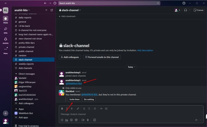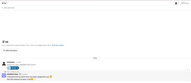 In any Slack channel where WebWork is added, users can @mention WebWork to initiate a conversation.