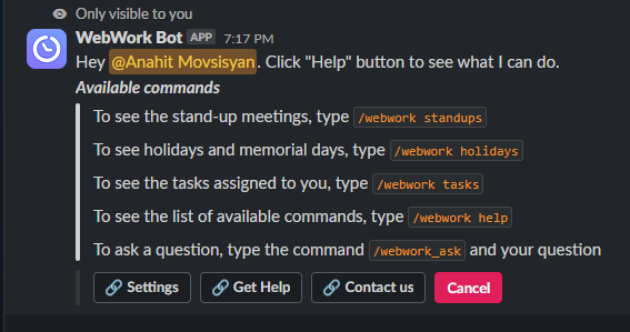 Users can interact with the WebWork Slack App in multiple ways. Commonly used methods include: