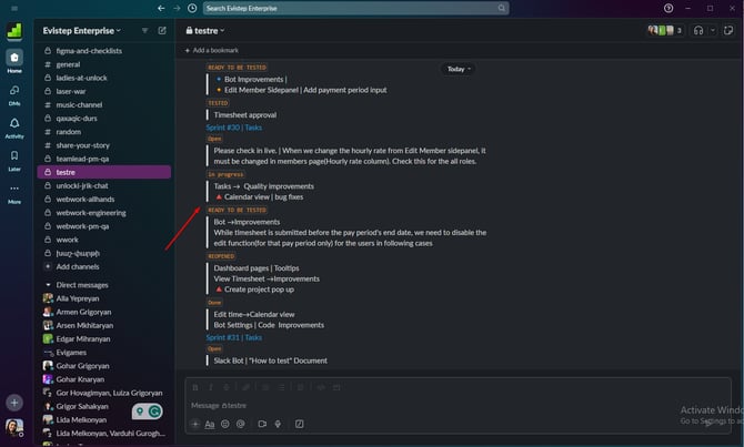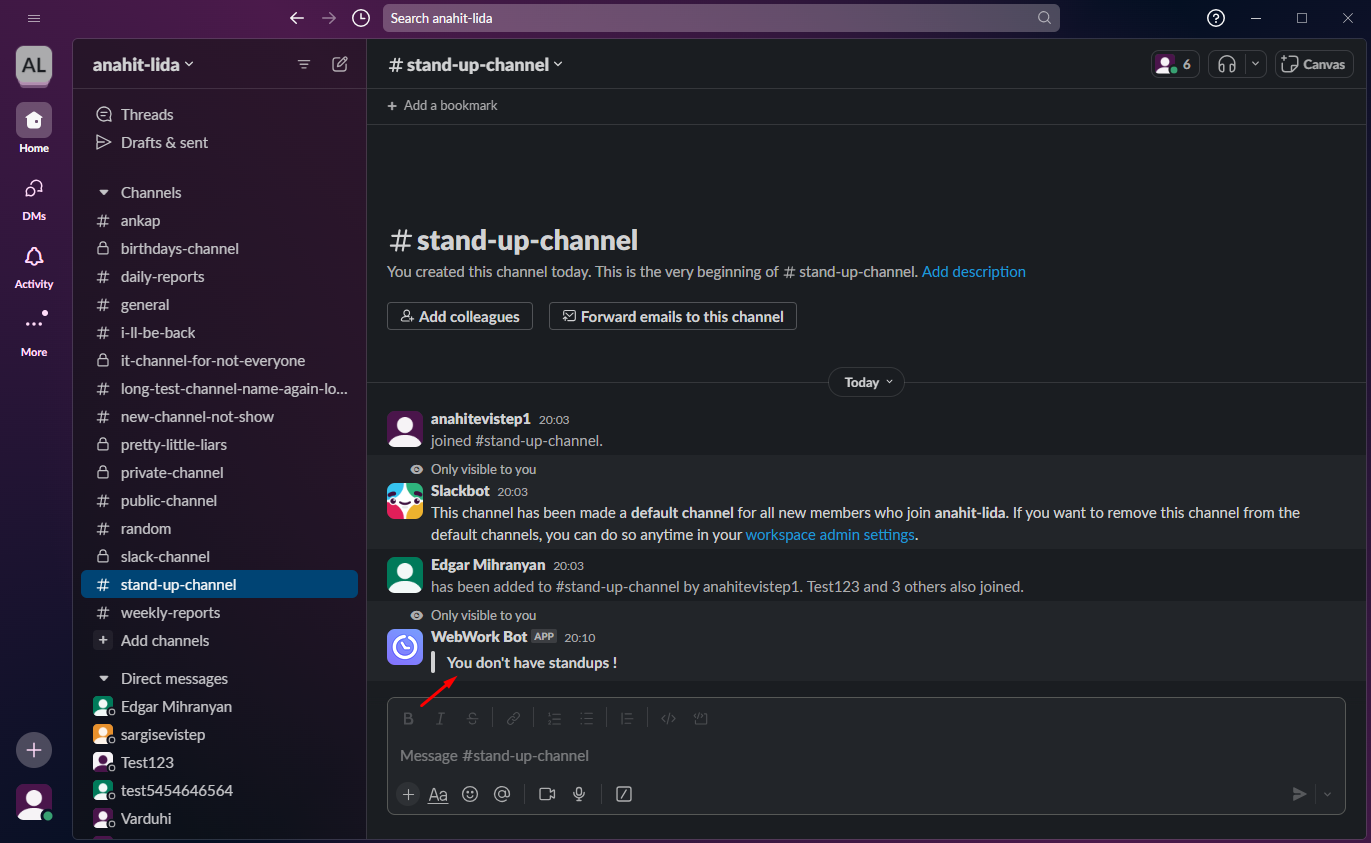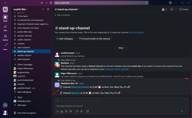When the Owner/Executive Manager creates a standup for the workspace and chooses the channel where it should be shown, the standup message is displayed at the selected time in the selected channel.