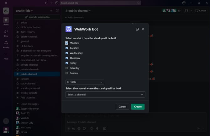 - When the user types**/webwork create standup or /webwork_ask create standup** in the channel and has permission to create standup (permission has the Owner and Executive Manager) → opens modal where can set the days of the week and the time for standup