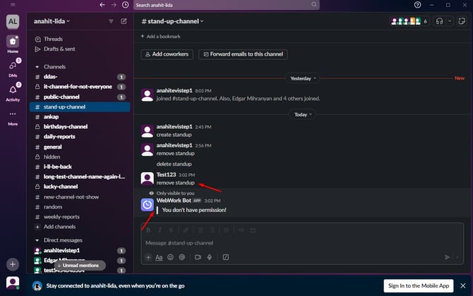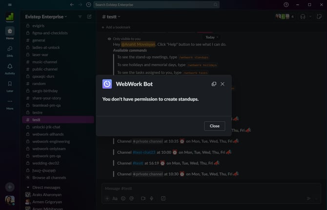 - If the user doesn't have permission to create a standup and types /webwork_ask remove standup or /webwork_ask delete standup on the channel is displayed the message "You don't have permission!”