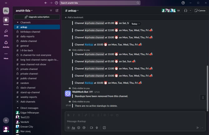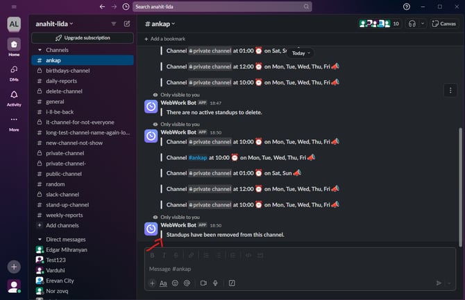 When the user types /webwork_ask remove standup or /webwork_ask delete standup in the channel and he has permission there is shown the message "Standups have been removed from this channel.”